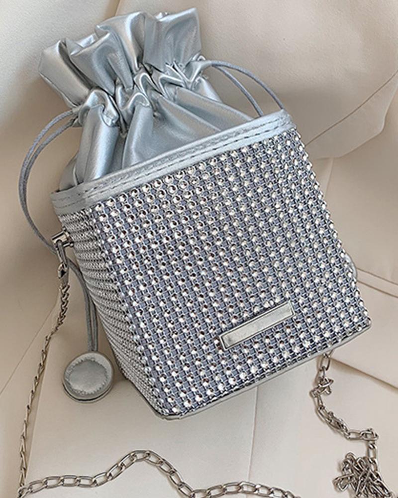 Ombre Allover Rhinestone Drawstring Bucket Bag, Silver