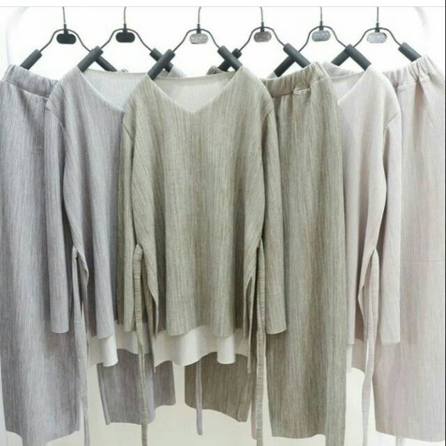 One set dengan celana pinggang karet ada belt buat ikat pinggang