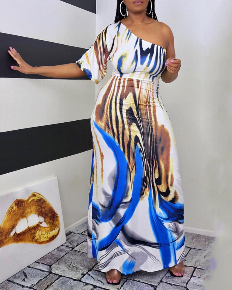 One Shoulder Animal Pattern Print Maxi Dress, Multicolor