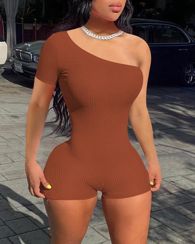One Shoulder Ribbed Skinny Romper, Coffee