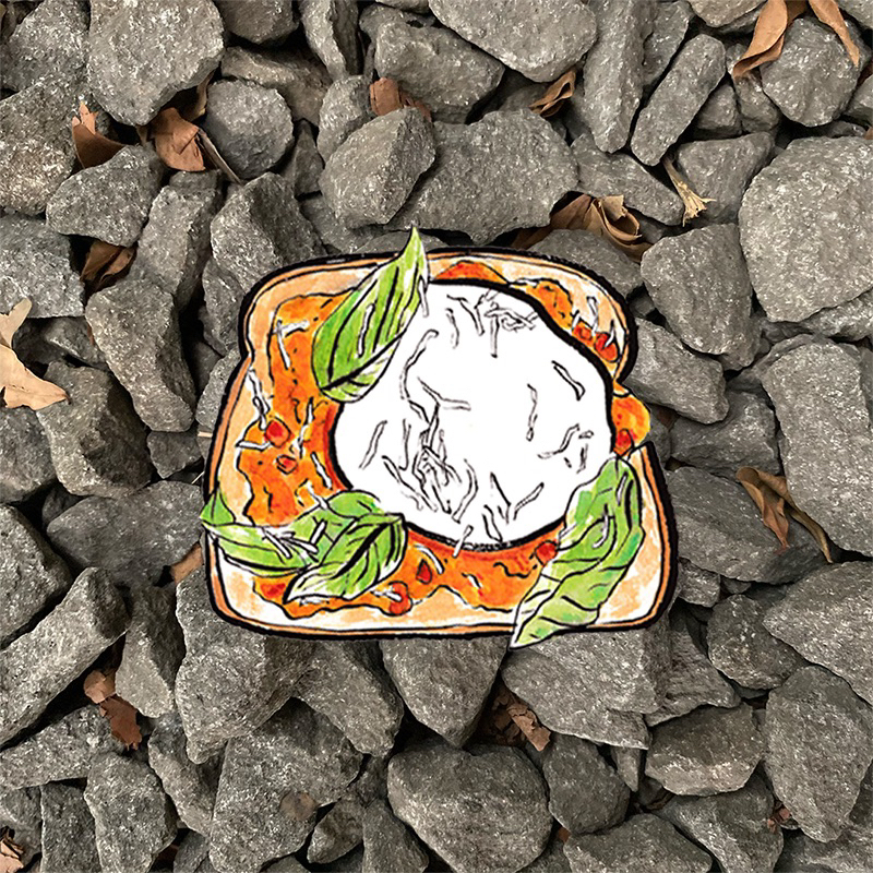 Stiker ilustrasi manual Open Toast dengan topping poached egg, marinara sauce, basil, and cheese (menggunakan watercolor & brush pen).