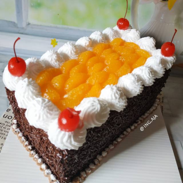 Bolu orange dilapis dgn frosting dan buah jeruk kalengan dihias dgn coklat meses dan toping jeruk.