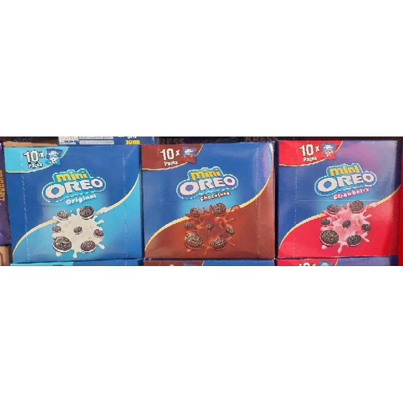 Oreo mini isi 10 pak rasa original, strawberry, coklat.