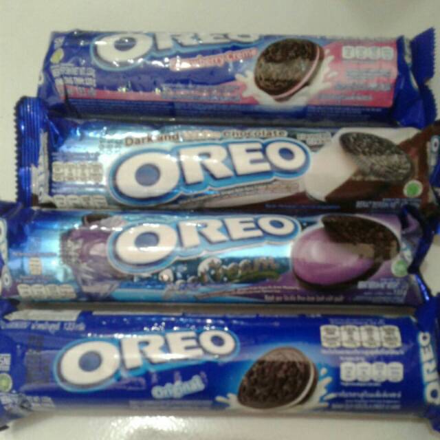 Biskuit sandwich coklat dengan krim rasa vanilla, es krim bluberry, coklat hitam & putih, strawberry.