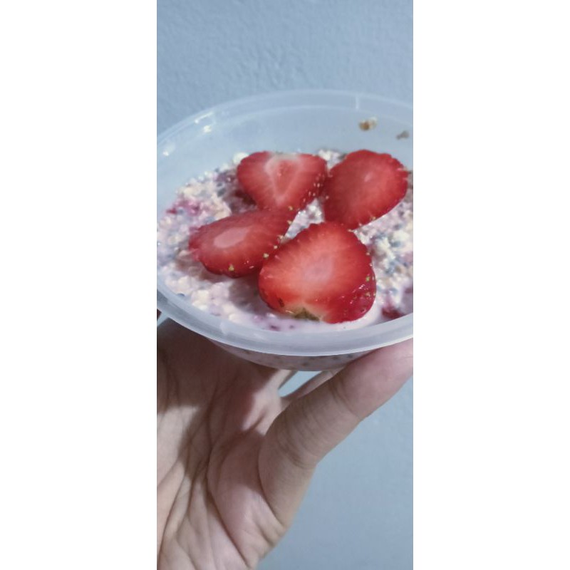 terbuat dari oats yg dicampur dengan chia seed, susu low fat, Yogurt & Buah-Buahan tanpa pengawet, gula atau pemanis buatan.