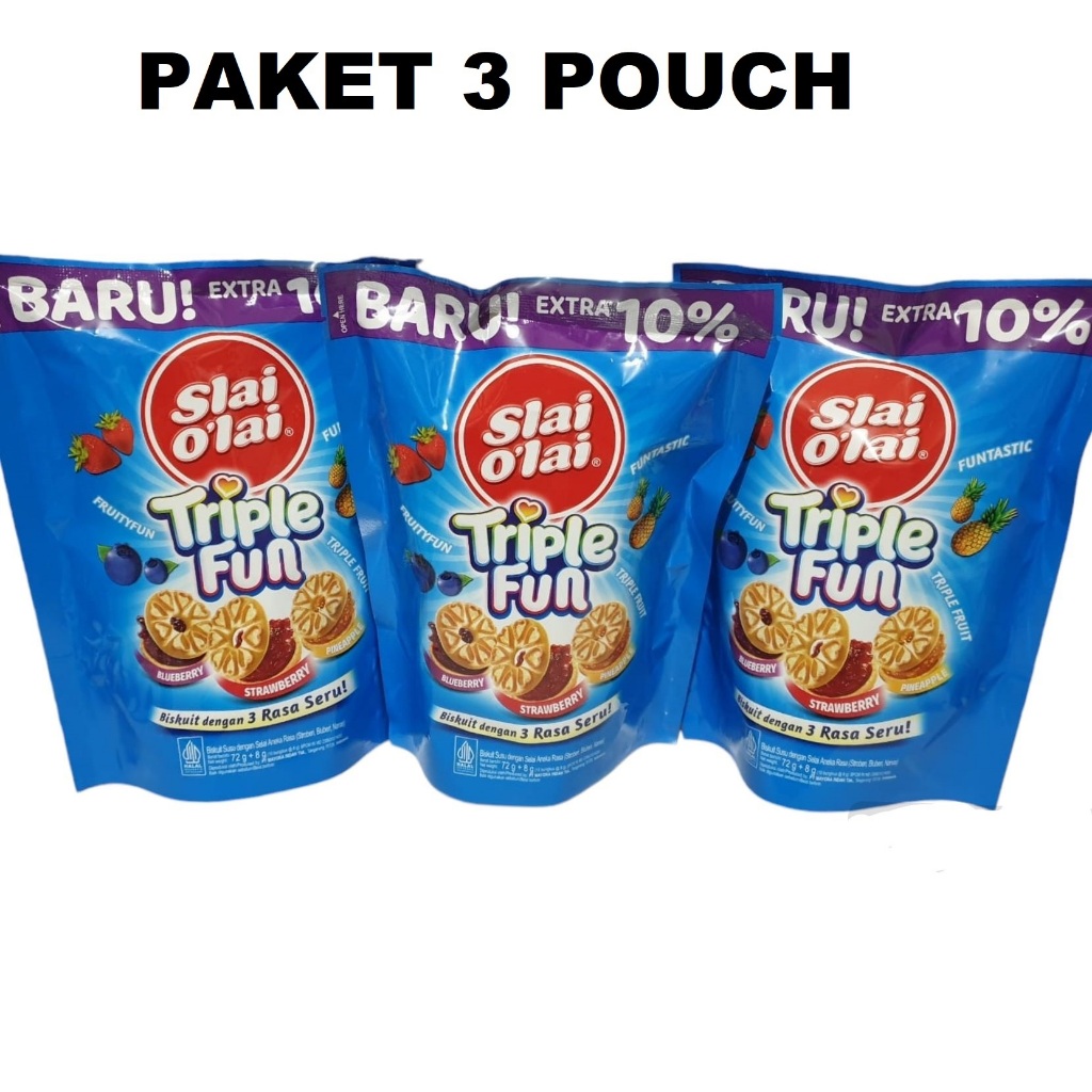 yuk cobain slai olai triple fun, biskuit dengan 3 rasa yang seru! dengan rasa strawberry, blueberry, dan nanas.