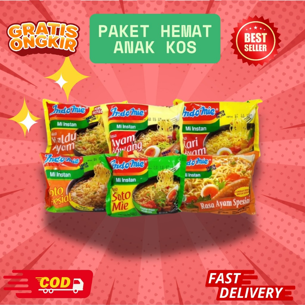 Lagi hidup irit ala anak kos? Tenang, ada solusi buat perut lapar tapi dompet mewek. Paket Hemat Anak Kos ini isinya 6 bungkus Indomie dengan rasa random yang siap nemenin hari-harimu. Bisa dapet rasa goreng, kuah, soto, ayam bawang, atau yang lainnya, tergantung hoki. Sensasi bukanya kayak unboxing mie kejutan.
