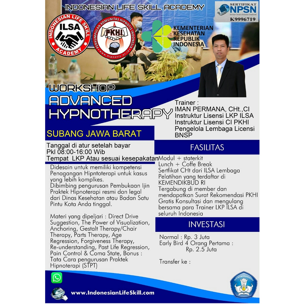 Cara ikut TOT Instruktur Hipnosis Hipnoterapi LKP ILSA akan diselenggarakan