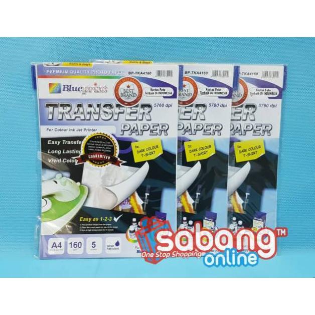 Kertas Transfer paper Dark merk Blueprint, isi 5 lembar A4. 160 gsm Khusus digunakan untuk sablon kaos warna hitam.