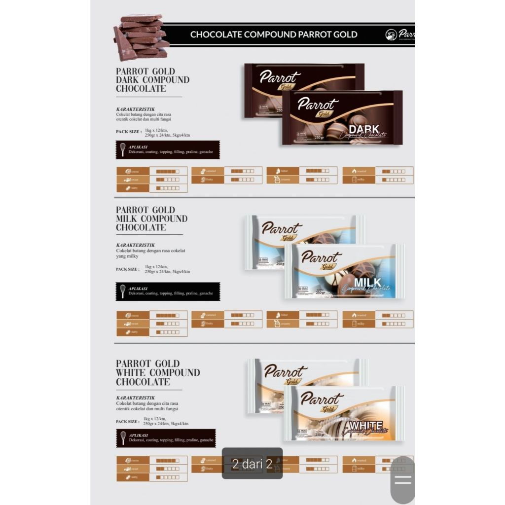 Parrot Compound Chocolate digunakan untuk food colouring, coating & ganache karena memiliki tekstur lebih cair.