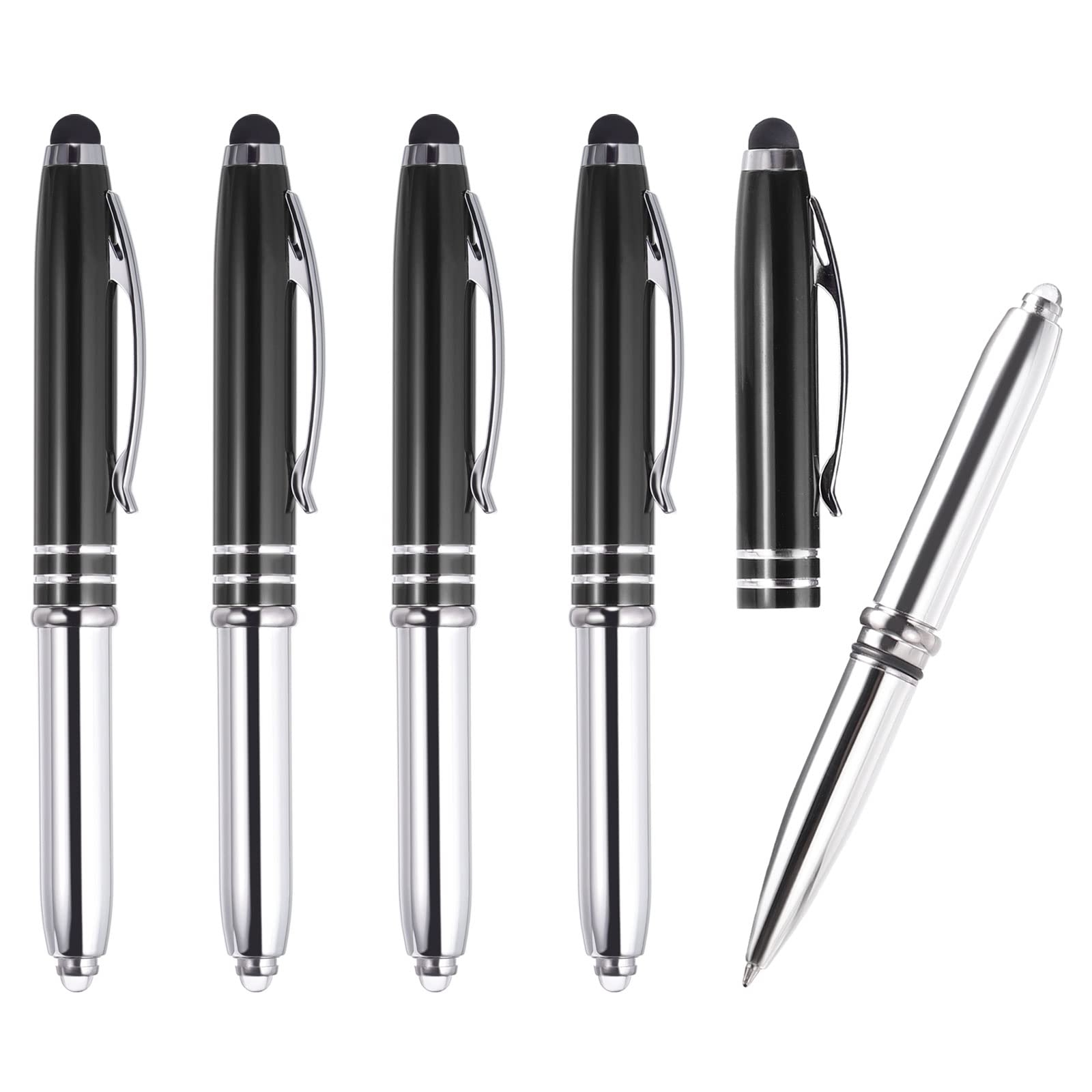 PATIKIL Пишущие инструменты Шариковая ручка Металлическая ручка Наконечник-стилус со светодиодным фонариком 3 в 1 Черные чернила Средний пишущий узел для сенсорного экрана Черный Упаковка из 5 штук