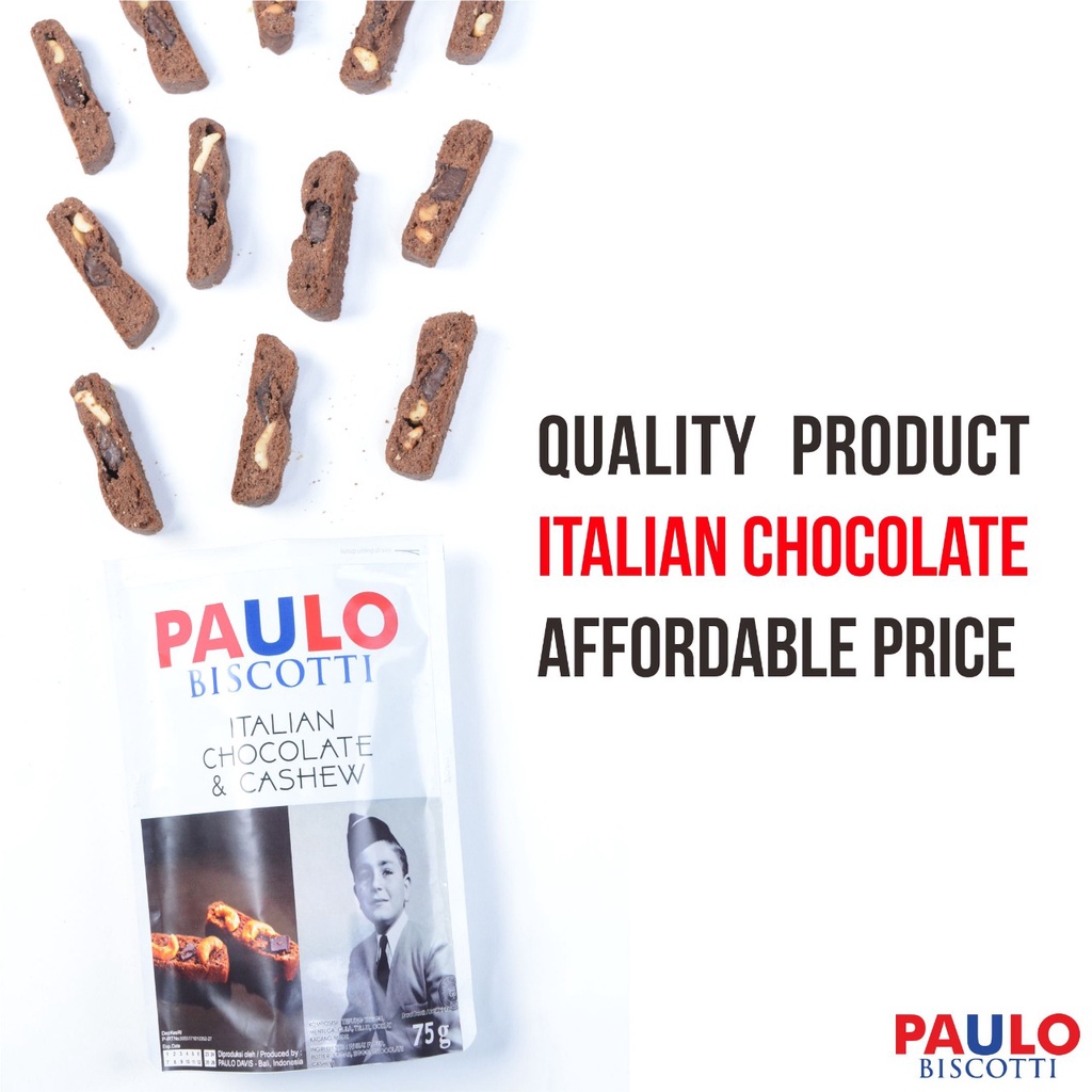 PAULO BISCOTTI adalah biskuit khas Italia yang sangat lezat, berlimpah dengan potongan cokelat hitam lezat, gurihnya kacang mede dan almond yang harum dan renyah.