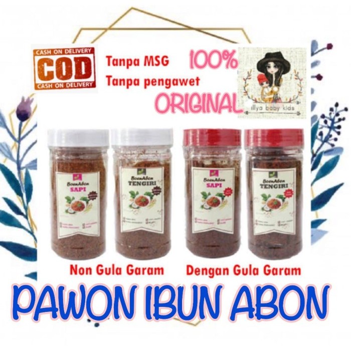 Abon yang terbuat dari daging sapi 100% serta rempah-rempah khusus sehingga menambah cita rasa dan aroma yang sangat nikmat. Tidak mengandung tepung, pengawet, MSG maupun zat kimia lainnya.