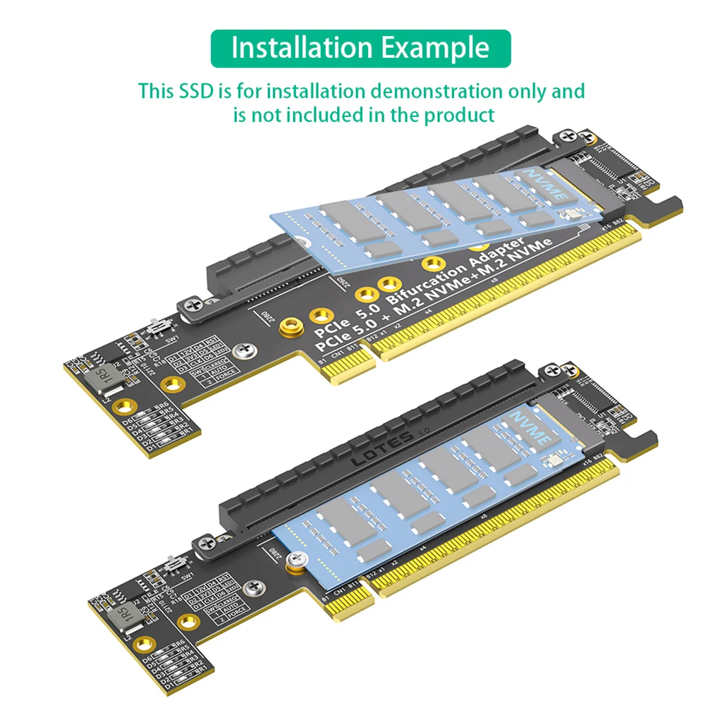 PCIE5.0 Bifurcation Adapter PCI-E Split Card PCI Express X16 to Dual NVME + PCIE X16 (PCIE X8 Signal) Riser Board for Desktop PC