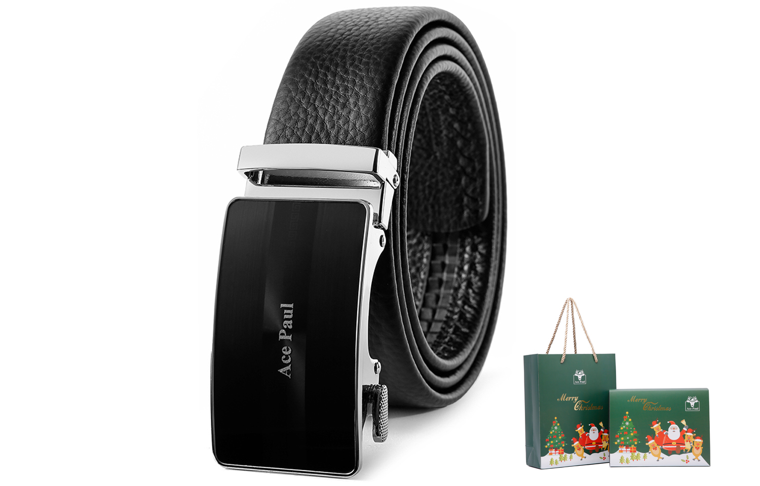 Кожаный ремень из коровьей кожи мужской черный ширина 3,5 см Ace Paul, пряжка черная серебристая 110 см + подарочная упаковка к Рождеству