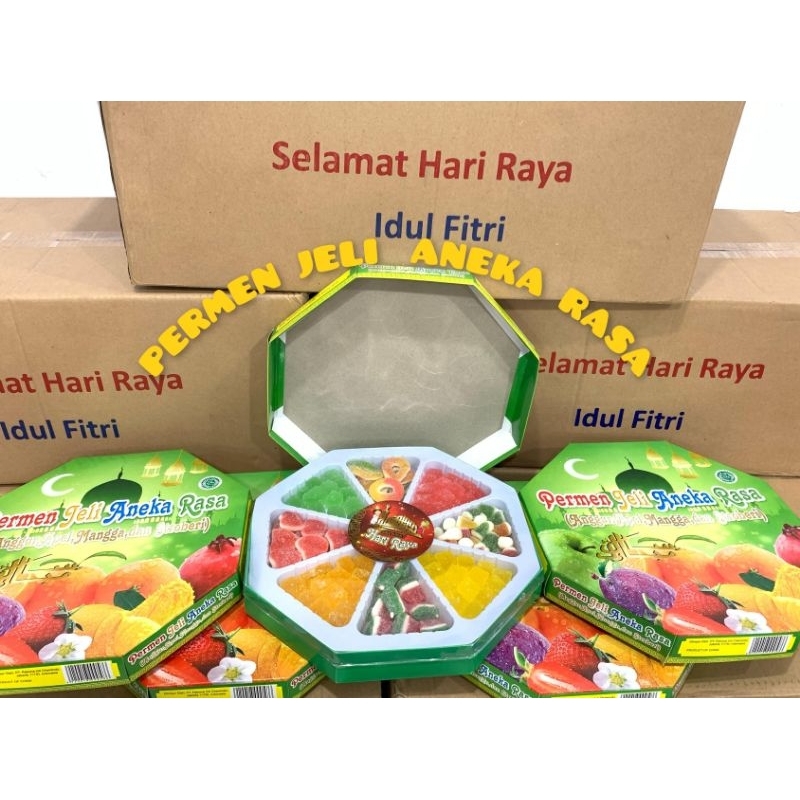 Permen jelly aneka rasa adalah permen lunak dengan tekstur kenyal dan berbagai pilihan rasa buah yang segar. Permen ini terbuat dari campuran air, gula, sari buah, dan bahan pembentuk gel seperti gelatin atau karagenan. Teksturnya yang kenyal dan lembut, serta rasanya yang manis dan asam dari buah, membuat permen jelly menjadi camilan yang populer.