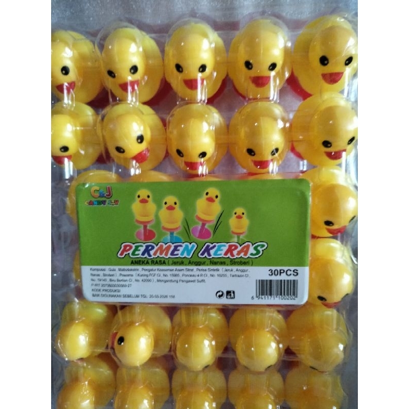 permen keras aneka rasa (apel,stroberi,anggur,nanas,)permen yang dikemas dlam mainan bebek yang bisa loncat loncat