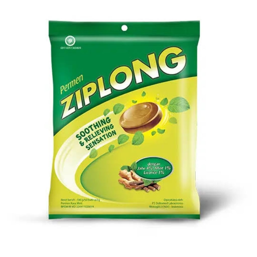Permen Ziplong adalah permen herbal yang diformulasikan untuk melegakan tenggorokan dan menyegarkan pernapasan. Permen ini mengandung ekstrak jahe, akar manis (licorice), jeruk nipis, dan peppermint oil, yang memberikan sensasi hangat dan segar pada tenggorokan.