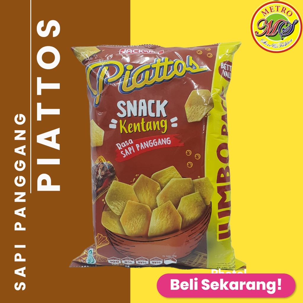 Piattos Sapi Panggang 120gr adalah salah satu camilan renyah dan gurih yang dapat menjadi pilihanmu. Merupakan keripik kentang berbentuk segi enam yang unik dengan tekstur yang tebal. Piattos dihasilkan dari kentang pilihan dan bumbu lezat yang akan menjadi kesukaanmu. Shelf life: 12 bulan . BPOM: MD 272910009019.