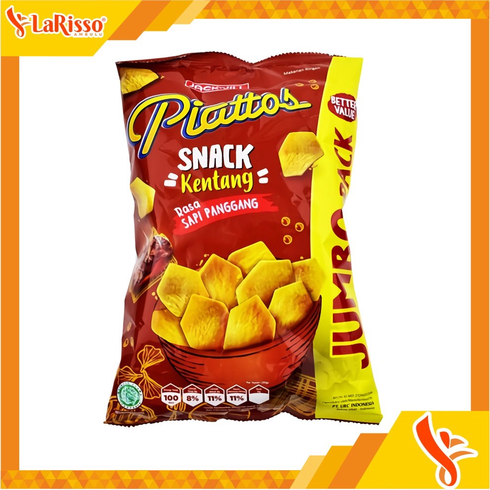 Piattos adalah keripik kentang berbentuk segi enam yang unik dengan tekstur yang tebal dan rasa sapi panggang yang istimewa. Piattos dihasilkan dari kentang pilihan dan bumbu lezat yang akan menjadi kesukaanmu. Rasakan kerenyahan dalam setiap gigitan.