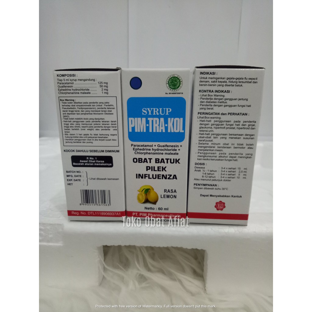 Pimtrakol sirup rasa lemon mengandung beberapa zat aktif yang diindikasikan untuk meringankan gejala - gejala flu seperti demam, sakit kepala, hidung tersumbat dan bersin - bersin yang disertai batuk pada anak - anak usia 1/2 tahun sampai 12 tahun. Obat ini memiliki rasa lemon yang disukai anak - anak sehingga tidak pahit.