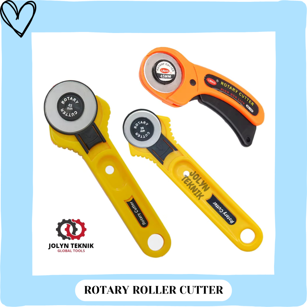 Pisau Roda: Pisau berbentuk roda yang dapat berputar, tersedia dalam ukuran diameter 28mm, 40mm, dan 45mm, memungkinkan untuk memotong dengan lebih mudah dan presisi.