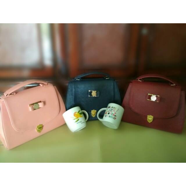 Tas dengan desai tutup pita & memakai kunci sodok menampilkan tas kelihatan simple dan mewah