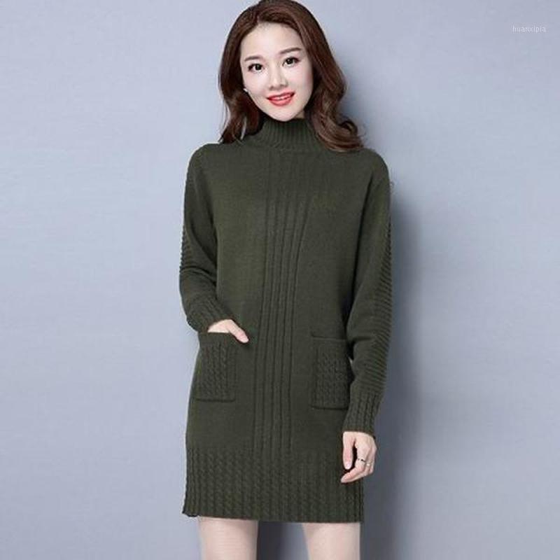High Collar Sweater Winter Knitting Sweaters Round Neck Large Size Sweater Skirt Woman Medium and Long Section1, Green