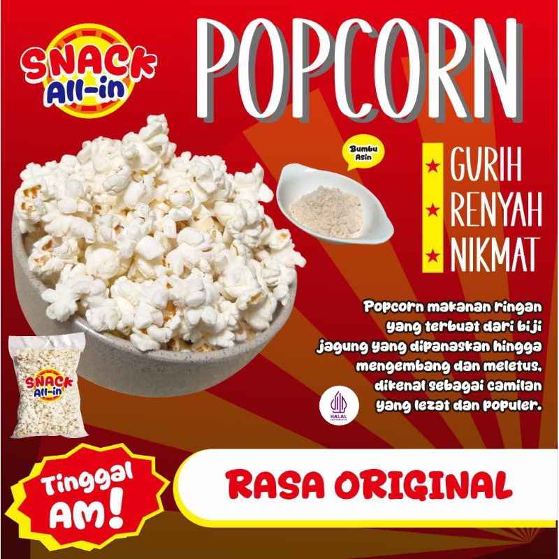 Snack Popcorn merupakan salah satu varian popcorn dengan cita rasa manis dan crunchy yang diproduksi dari jagung berkualitas dan diolah dengan bumbu yang kemudian di proses dan di kemas secara higenis sehingga aman untuk dikonsumsi. Cocok banget jadi camilan saat streaming film bersama keluarga.