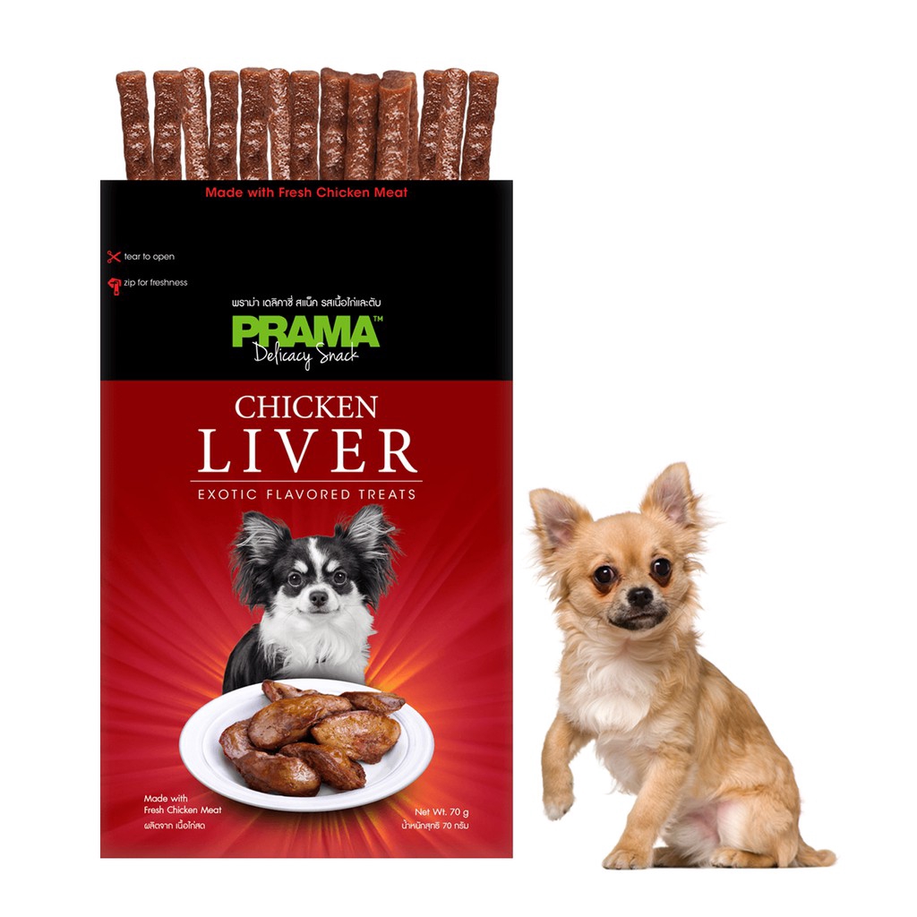 PRAMA chicken liverA premium dog treat made in Thailand. Satisfaction guaranteed :)IngredientsChicken Meat, Chicken Liver, Tapioca Flour, Wheat Flour, Soy Protein, SobitolPowder, Glycerin, Wheat Gluten, Gelatin, Salt, Coloring, Preservative.Bahan dasar:daging ayam, hati ayam, tepung tapioka, tepung terigu, protein kedelai, bubuksobitol, gliserin, gluten gandum, gelatin, garam, pewarna, bahan pengawet.Feeding InstructionsFeed as a snack or reward to dog, aged over 3 monthsDog Weight1-5 kg5-10 kg10-20 kgOver 20 kgAmount1-2 pcs/day2-3 pcs/day3-5 pcs/day5-7 pcs/dayNutritional AnalysisCrude Protein (min)Crude Fat (min)Crude Fiber (max)Moisture (max)20.00%15.00%1.50%18.00%Additional InformationStore in a cool, dry place, PET FOOD ONLYSuitable for all breedsOnce opened, consume within 7 daysMade with Fresh Chicken Meat