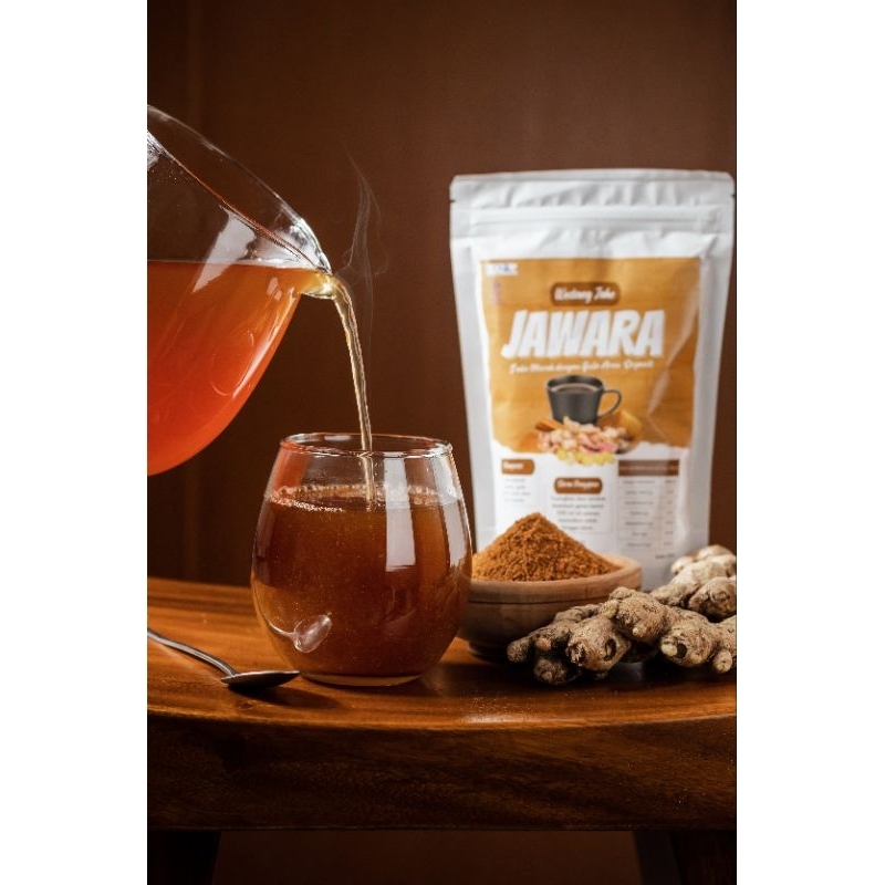 Wedang Jahe Merah Jawara dibuat dari Jahe merah bubuk lokal premium dan rempah pilihan, di proses secara alami tanpa bahan pengawet, tanpa pewarna makanan.