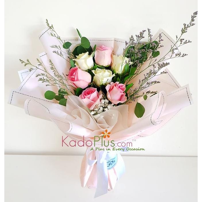 Buket Bunga (buket wisuda, buket ulang tahun) dengan 7 bunga mawar, baby breaths, caspea, dan daun daun, dibungkus Korean wrapper.