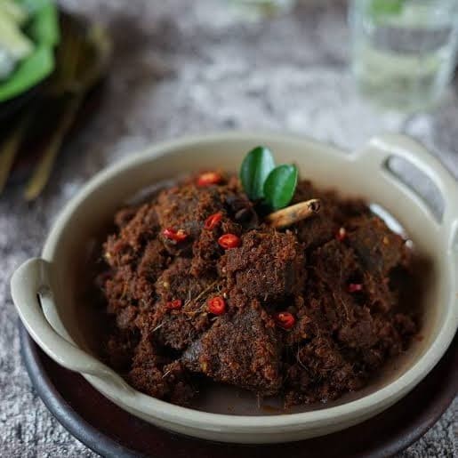 3. Teruskan memasak hingga air menyusut dan daging agak berwarna kehitaman, dan santan berminyak. Angkat, sajikan hangat.