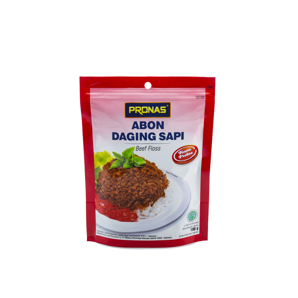 PRONAS Paket Lengkap Abon Sapi Free Cannister Keunggulan : - Abon Daging Sapi Pronas terbuat dari daging sapi dan bumbu berkualitas, dengan pengolahan yang higienis menjadikan cita rasa yang gurih dan nikmat. Detail : - Cocok untuk segala jenis hidangan, praktis dan higienis - Kemasan praktis dengan sistem ziplock, bisa di tutup kembali setelah di buka Komposisi : - Daging sapi, kacang koro, gula, bawang goreng, garam bawang merah, rempah-rempah Isi Paket: - Abon Sapi Original 100 gr 1pcs - Abon Sapi Chili 100 gr 1pcs - Abon Sapi Bawang 100 gr 1pcs Berat : 100 g BPOM : MD 239511001261 Halal : 15010001450907 Isi per karton : 24 pcs Masa kadaluarsa : 12 bulan