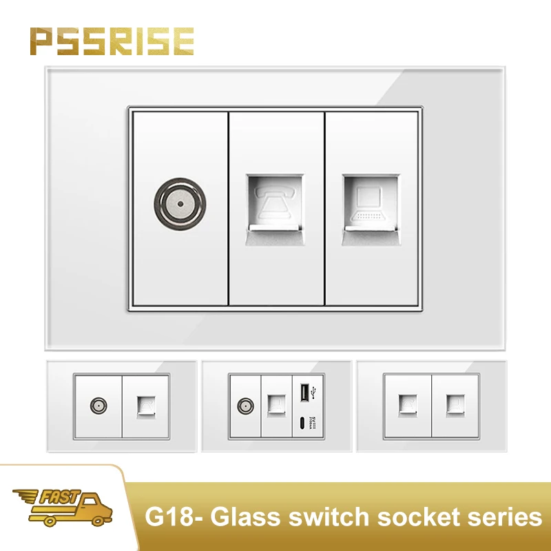 PSSRISE White ALL Countries Universal Wall Socket 2.1A USB Type C Charger Power Socket Glass Panel TV TEL Computer Socket Switch