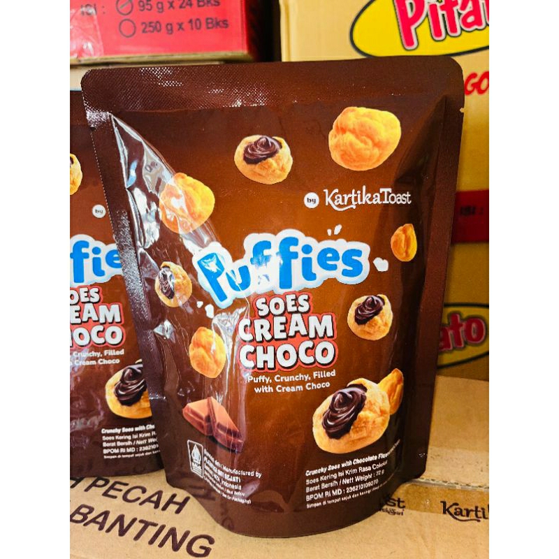 Puffies Soes Cream Chocolate adalah soes kering dengan isi cokelat yang memiliki kulit tebal dan cream filling yang manis dan gurih. Puffies Soes Cream Chocolate memiliki beberapa keunggulan, yaitu: Crunchy-nya pas, Isinya melimpah, Renyah dikunyah, Lembut di lidah.