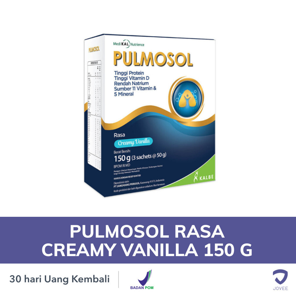 PULMOSOL mengandung tinggi protein 12.5 gram/saji, mengandung BCAA, tinggi antioksidan dan Zink, sumber omega 3, EPA, DHA, Omega 6.