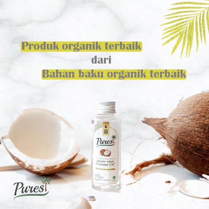 Pures Organic VCO terbuat dari bahan baku kelapa segar, diproses tanpa proses pemanasan sehingga bening serta wangi kelapa (tidak bau tengik)