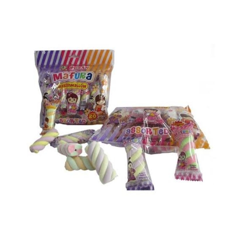 Pusan Mafura Marshmallow Assorted Permen adalah Marshmallow berbentuk twist dengan aneka rasa buah, seperti Stroberi, Jeruk, & Anggur. Permen ini cocok dinikmati saat sedang bersantai dengan keluarga atau teman Anda. Satu bag isi 20 content atau pcs.