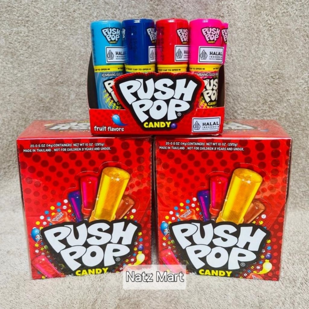 Push Pop Candy merupakan Permen Manis dengan rasa buah (Strawberry,Lychee lush,Blue Raspberry,Berry Blast) yang dikemas dalam bentuk yang unik seperti Lipstik.