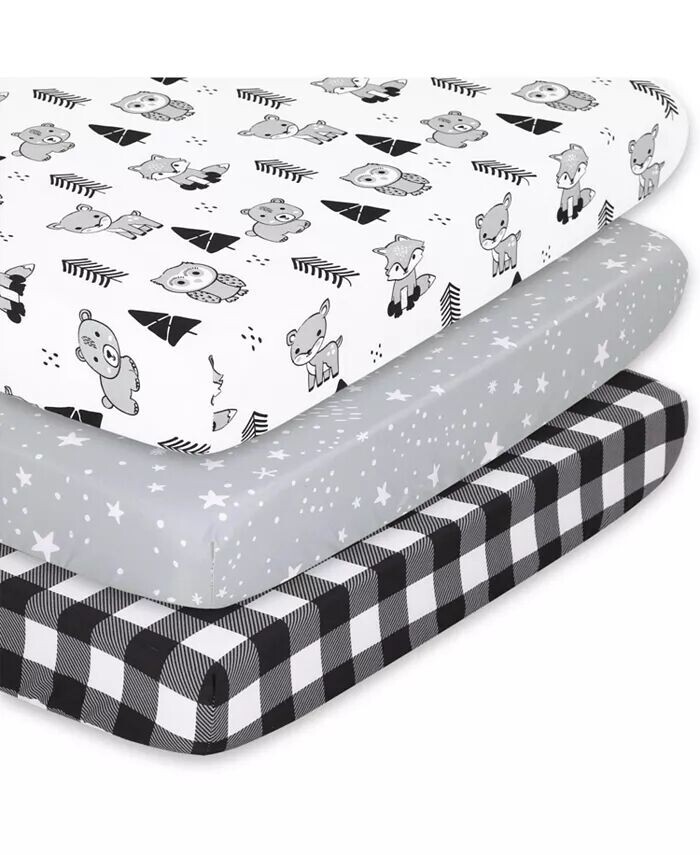 Листы для игр Peanutshell Pack n Play подойдут к любой мини-кроватке, игровой площадке, пакету и игре или портативной кроватке. Набор простыней для игровой площадки Wonderful Woodland включает в себя три принта на лесную тему в сером, черном и белом цветах: один с милыми медведями, совами, деревьями, лисами и персонажами оленей, звездами и рисунком в клетку буйвола.