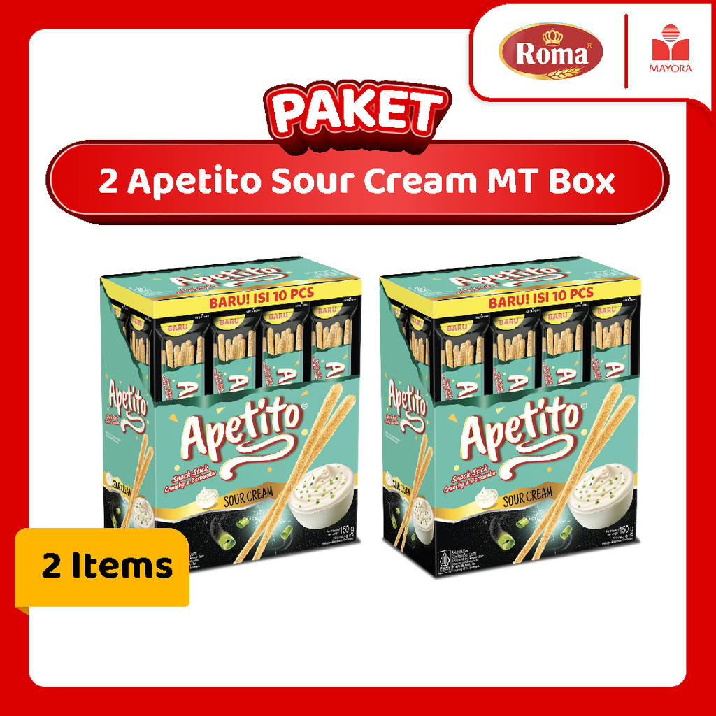 Biskuit Roma Apetito Sour Cream adalah biskuit stik dengan rasa krim asam. Biskuit ini memiliki tekstur renyah dan gurih, serta dikemas dalam tray agar tetap terjaga kerenyahannya.