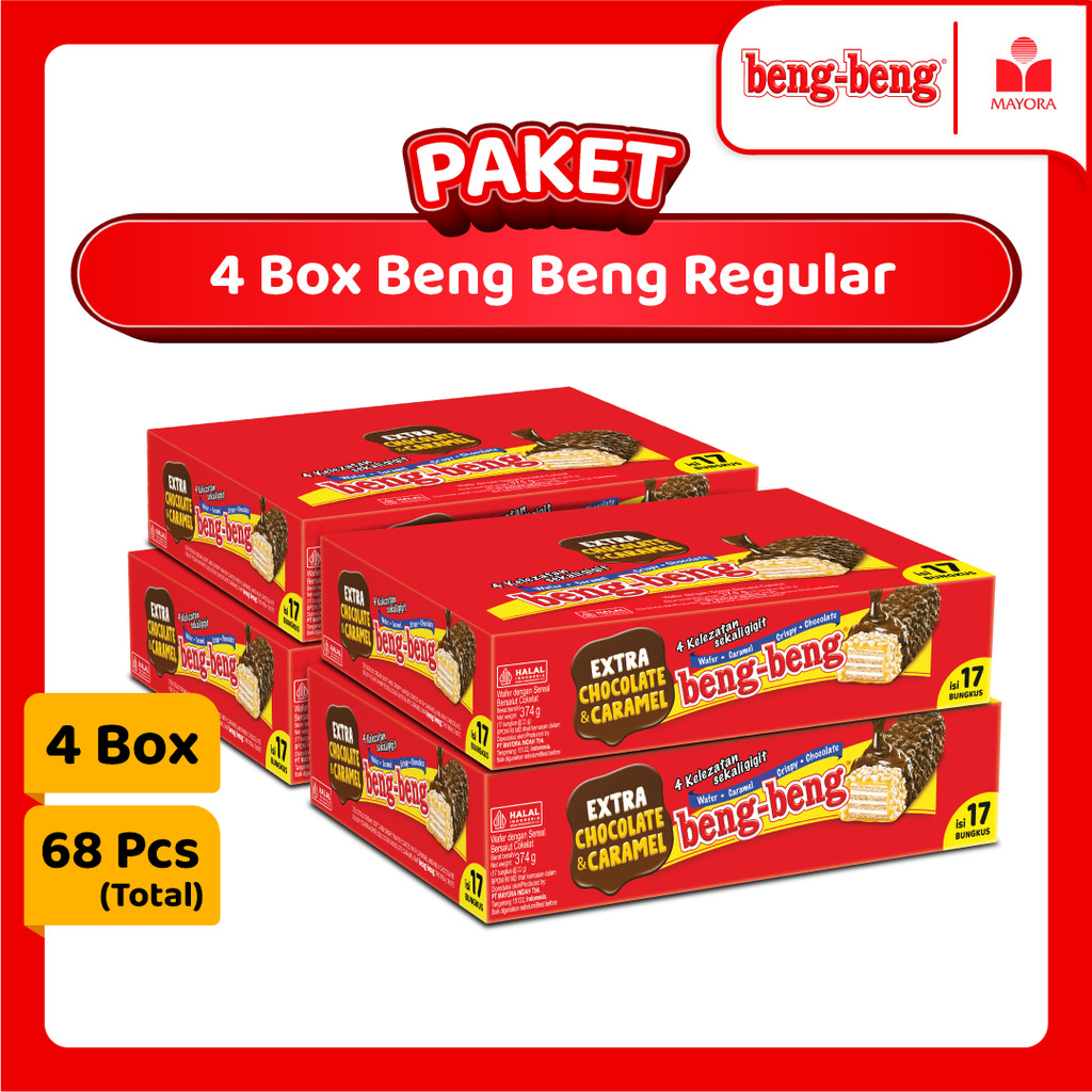 Beng Beng Regular adalah wafer cokelat yang terdiri dari beberapa lapisan, wafer renyah, karamel, dan lapisan cokelat. Camilan ini populer karena kombinasi tekstur dan rasa cokelat yang khas. Wafer ini terbuat dari bahan pilihan yang nikmat. Selain itu, wafer ini memiliki kemasan yang praktis dan mudah untuk dikonsumsi. Ideal dijadikan cemilan sehat saat santai Anda bersama keluarga.