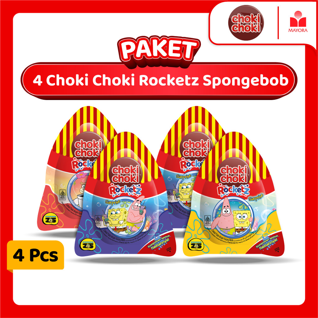 Choki Choki Rocketz SpongeBob adalah camilan cokelat pasta yang dikemas dalam format stik, dengan rasa cokelat berkualitas dan susu krim, serta sentuhan kacang mede (cashew) yang digemari anak-anak. Selain itu, kemasannya juga menampilkan karakter-karakter dari serial animasi SpongeBob SquarePants, yang membuatnya semakin menarik. Ada hadiahnya juga loh..!!