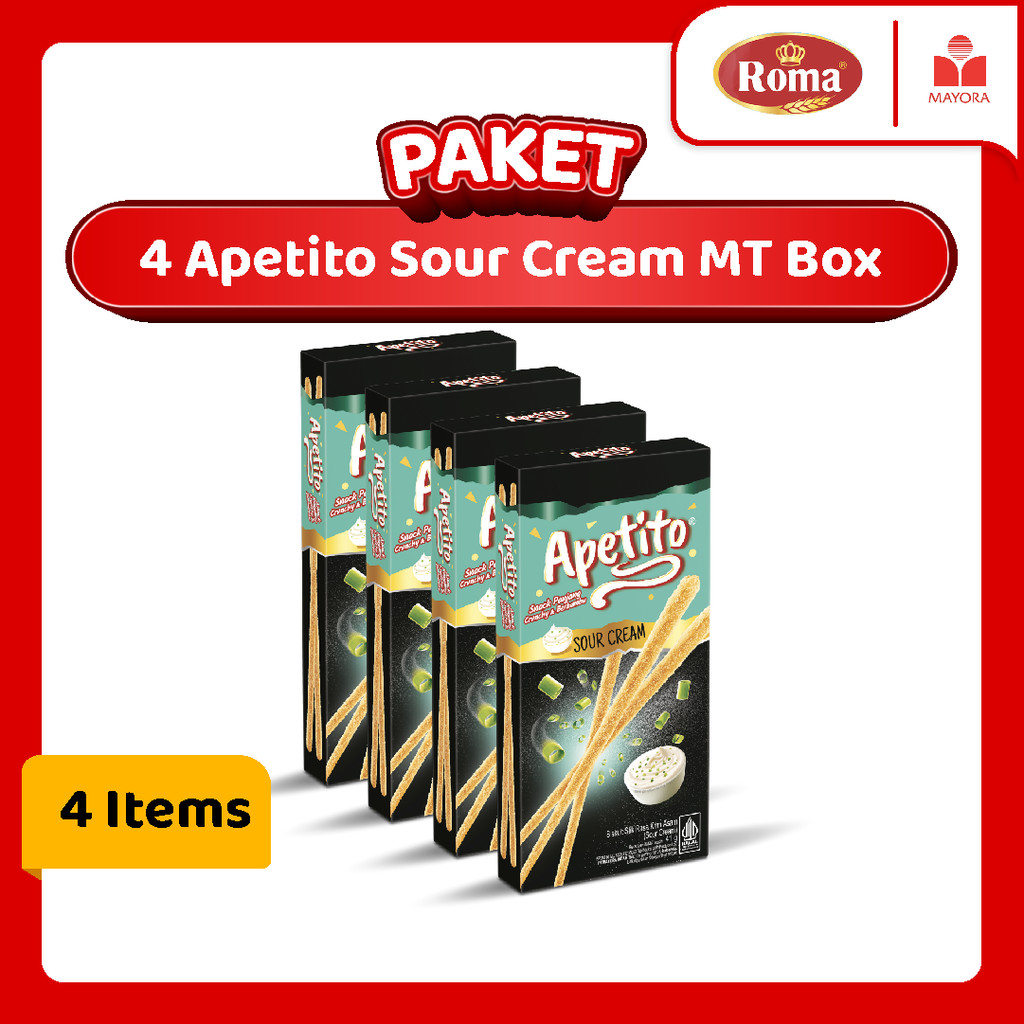 Biskuit Roma Apetito Sour Cream adalah biskuit stik dengan rasa krim asam. Biskuit ini memiliki tekstur renyah dan gurih, serta dikemas dalam tray agar tetap terjaga kerenyahannya.