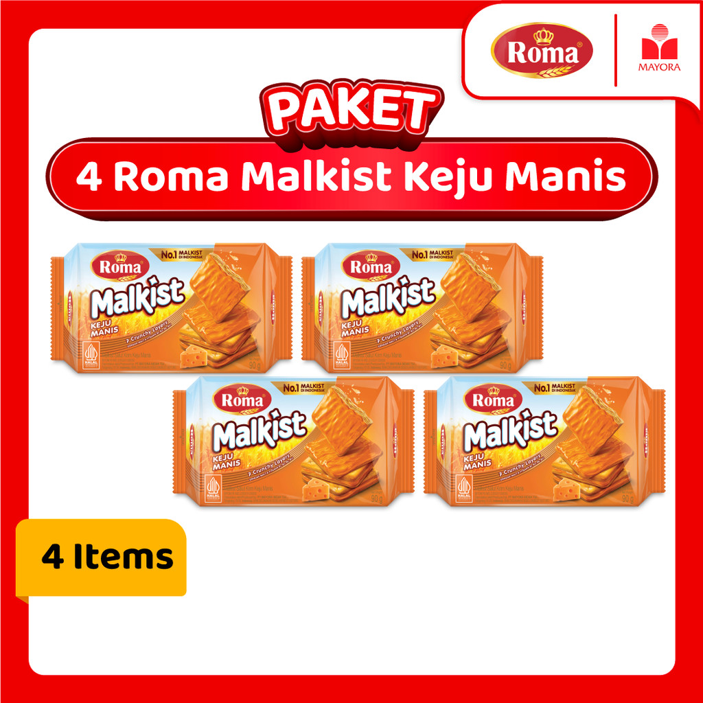 Roma Malkist Keju manis adalahbiskuit berbentuk persegi yang dibalut dengan lapisan keju manis. Biskuit ini mengandung vitamin B1, B2, B6, dan B12. Roma Malkist Keju telah memiliki izin BPOM dan sertifikat Halal MUI sehingga aman untuk dikonsumsi.