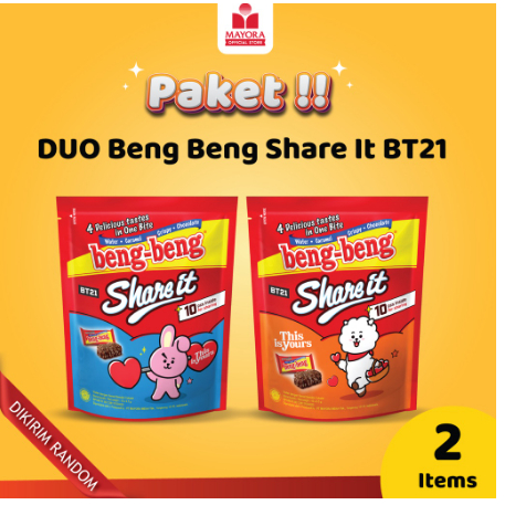 BENG-BENG Share It Special Edition BT21 merupakan wafer cokelat dengan rice crispy yang berbalut cokelat susu yang nikmat. Lapisan cream yang lezat dan lembut, cemilan ini tidak bisa ditolak oleh segala usia. Sangat cocok untuk cemilan dikala senggang, dimana saja dan kapan saja atau ideal juga dijadikan cemilan sehat saat santai Anda bersama keluarga.
