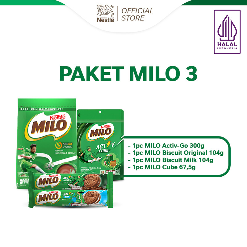 Buy 1 Pcs MILO ACTIV-GO Susu Coklat Pouch 300g + 1 pcs Milo Activ Milk Biscuit 104gr + 1 Pcs Milo Activ Original Biscuit 104gr + 1 Pcs MILO Activ Cube 67.5gr