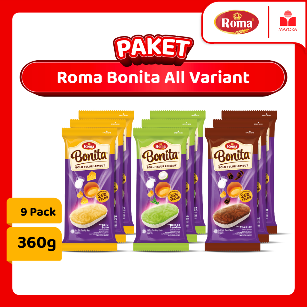 Roma Bonita Bolu Telur Lembut 30gr Varian Rasa : Bolu Keju Susu - Bolu Kelapa Pandan - Bolu Cokelat .Bolu Telur Lembut Kenyang di Perut 25% terbuat dari telur asli Cobain rasa lainnya Yuk !