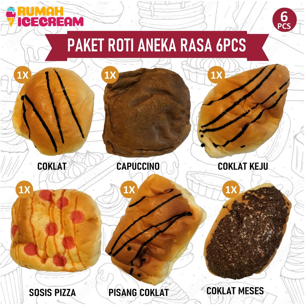 1 paket isi 6 pcs, rasa: Coklat, Coklat Keju, Capuccino, Sosis Pizza, Pisang Coklat, dan Meses Coklat